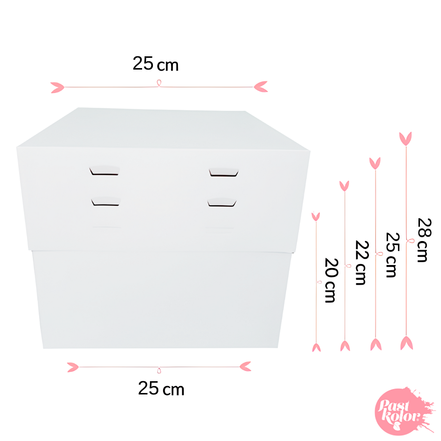 Caja blanca de calidad profesional, hecha de cartón resistente, perfecta para proteger y transportar tus creaciones. Se compone de 2 piezas (base y tapa) y se envía desmontada para prevenir daños durante el transporte. Fabricada con cartón resistente y de calidad alimentaria.