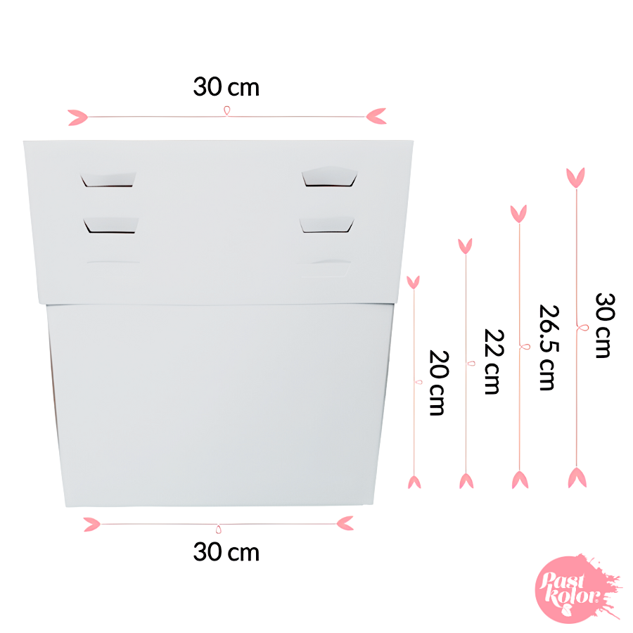 Caja blanca de calidad profesional, hecha de cartón resistente, perfecta para proteger y transportar tus creaciones. Se compone de 2 piezas (base y tapa) y se envía desmontada para prevenir daños durante el transporte. Fabricada con cartón resistente y de calidad alimentaria.