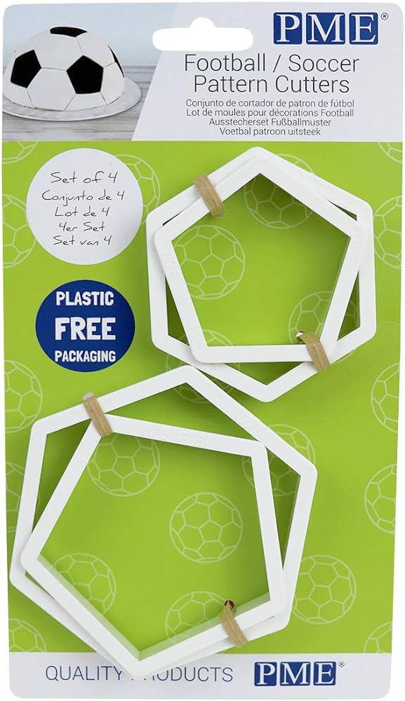 Celebra tu pasión por el fútbol con los cortadores de PME. Con este set, podrás crear fácilmente pasteles temáticos con un aspecto profesional. Ahorra tiempo y esfuerzo gracias a estos cortadores, que te garantizan cortes limpios y precisos en cada uso. Ideal para utilizar con tartas esféricas de 15 o 20 cm, podrás lograr la forma perfecta de una pelota de fútbol en tus creaciones reposteras.