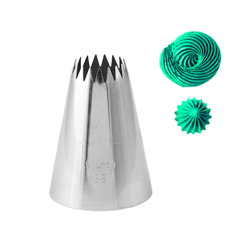 Otorga a tus cupcakes, pasteles y galletas un acabado espectacular con técnicas de flores, conchas, remolinos y estrellas gracias a esta boquilla de estrella grande. Indispensable para cualquier decorador de repostería, esta boquilla facilita la creación de diseños impresionantes. Para una mayor comodidad de uso y sujección, esta boquilla combina con el adaptador de tamaño grande de Wilton o con el adaptador para boquillas 2 en 1 que permite trabajar con boquillas grandes y pequeñas en la misma manga pastelera. Fabricada en acero inoxidable, la boquilla está grabada con su número para una fácil identificación y está diseñada para resistir el uso continuado. Segura para lavavajillas en la bandeja superior, garantizando una limpieza sin complicaciones después de cada uso. Eleva tus creaciones reposteras con esta boquilla de estrella grande, la elección perfecta para resultados sorprendentes